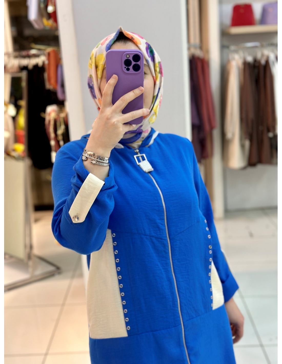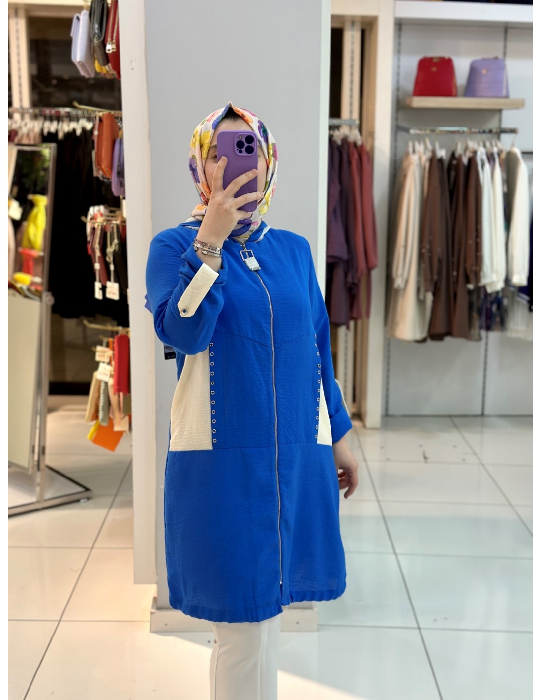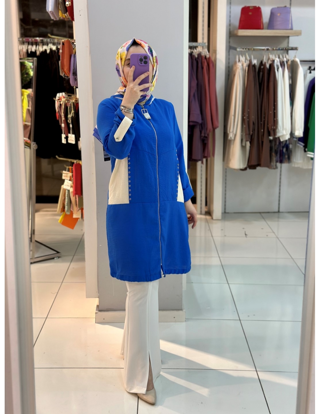 N Prive File Detaylı Kapşonlu Keten Kap 14044 Mavi